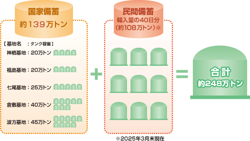 現在、法律によって備蓄が義務づけられているエネルギーは、石油とLPガスの二種類だけです(天然ガスには備蓄義務がありません)。 このうち、民間企業が備蓄しているものを「民間備蓄(法定備蓄)」、国家が備蓄しているものを「国家備蓄」と言います。LPガスの場合、輸入量の40日分(約108万トン)が民間備蓄として義務づけられています。これと国家備蓄とを合わせると、全体で約248万トン※のLPガスが備蓄されていることになります。
