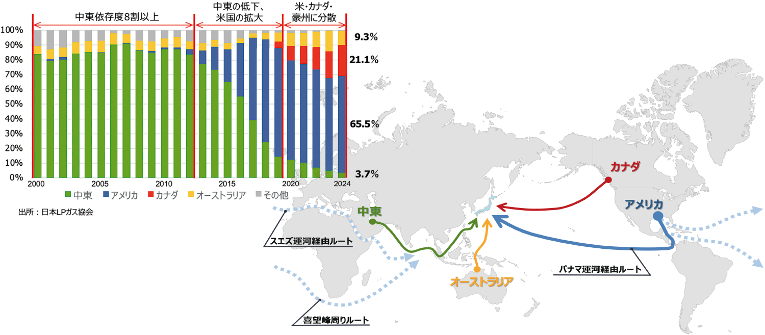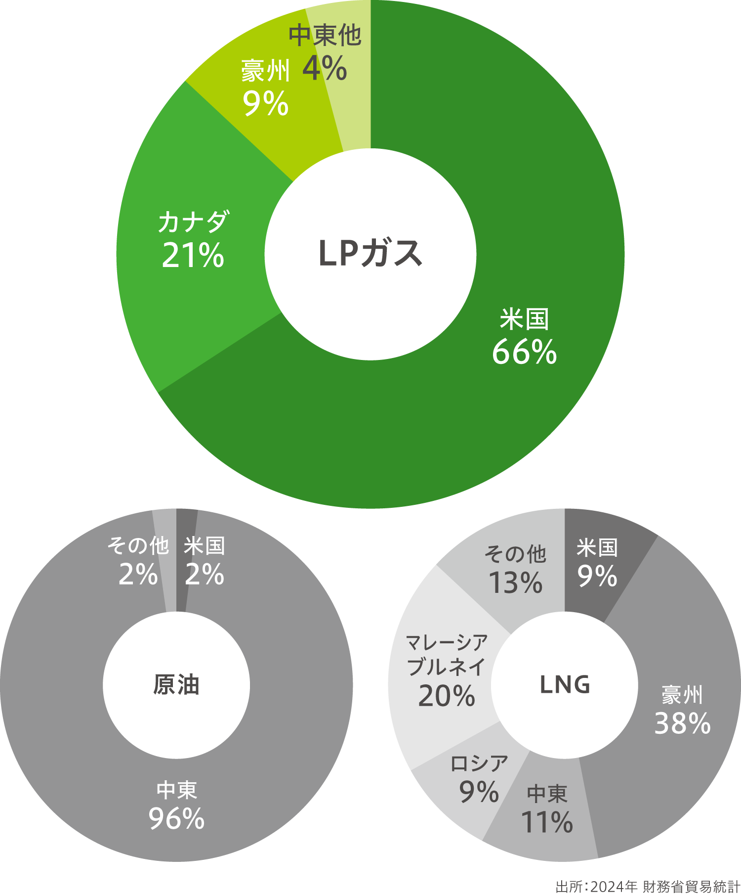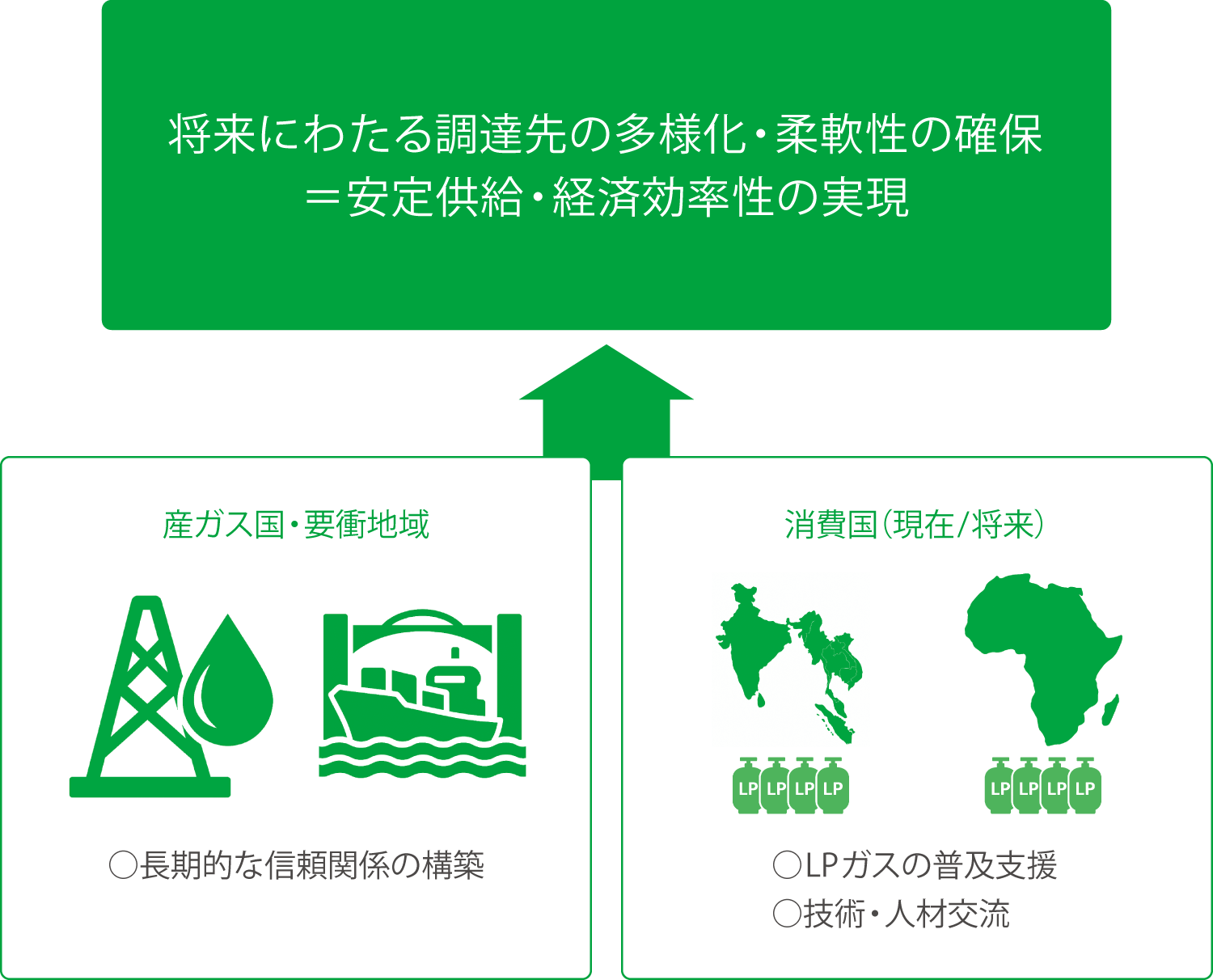 国際的な紛争や政治情勢等の地政学リスクに左右されないLPガスの輸入体制を、将来にわたり維持する。