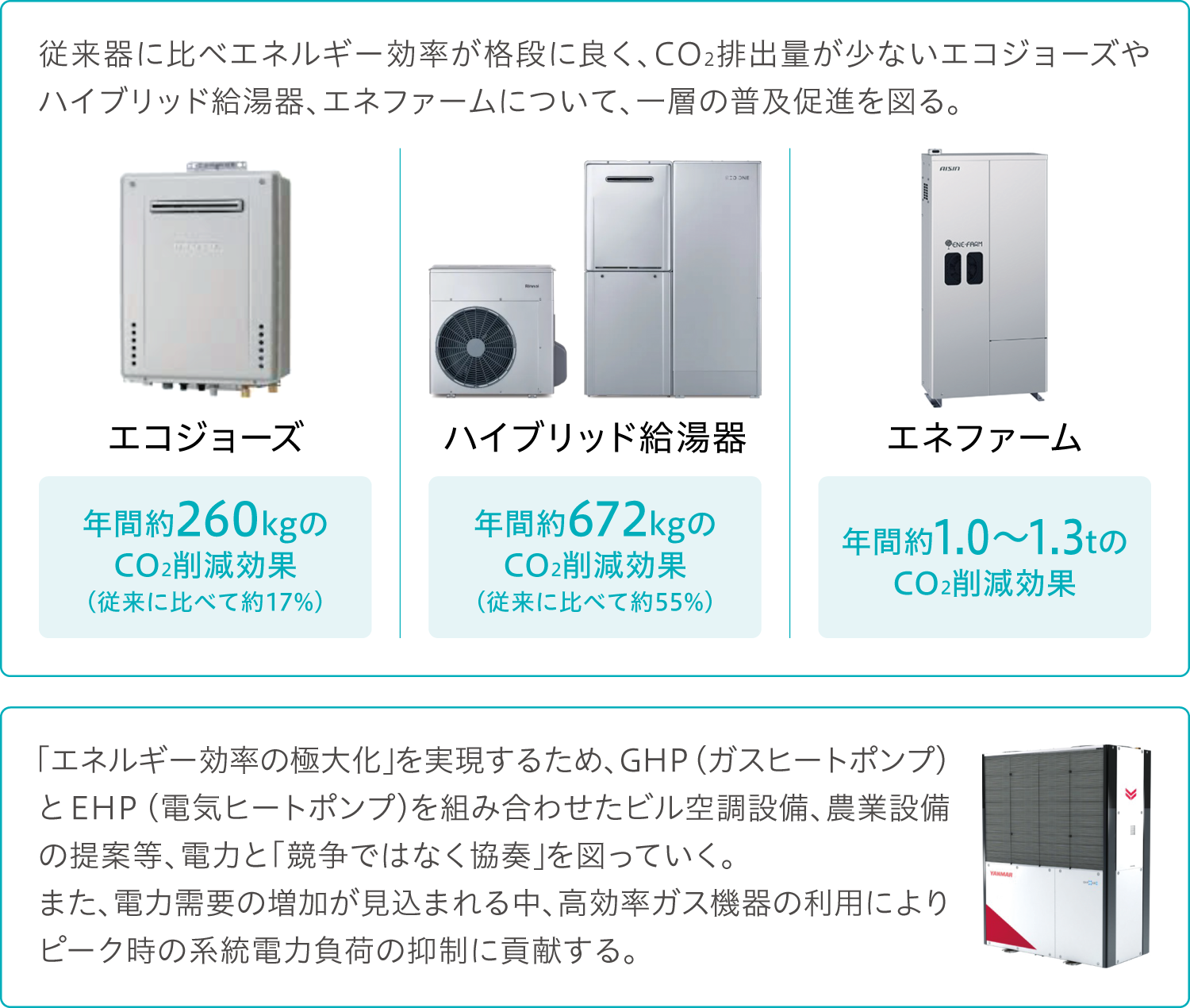 産業用・家庭用の高効率なLPガス機器の普及拡大による省エネと、LPガスへの燃料転換を推進していく。