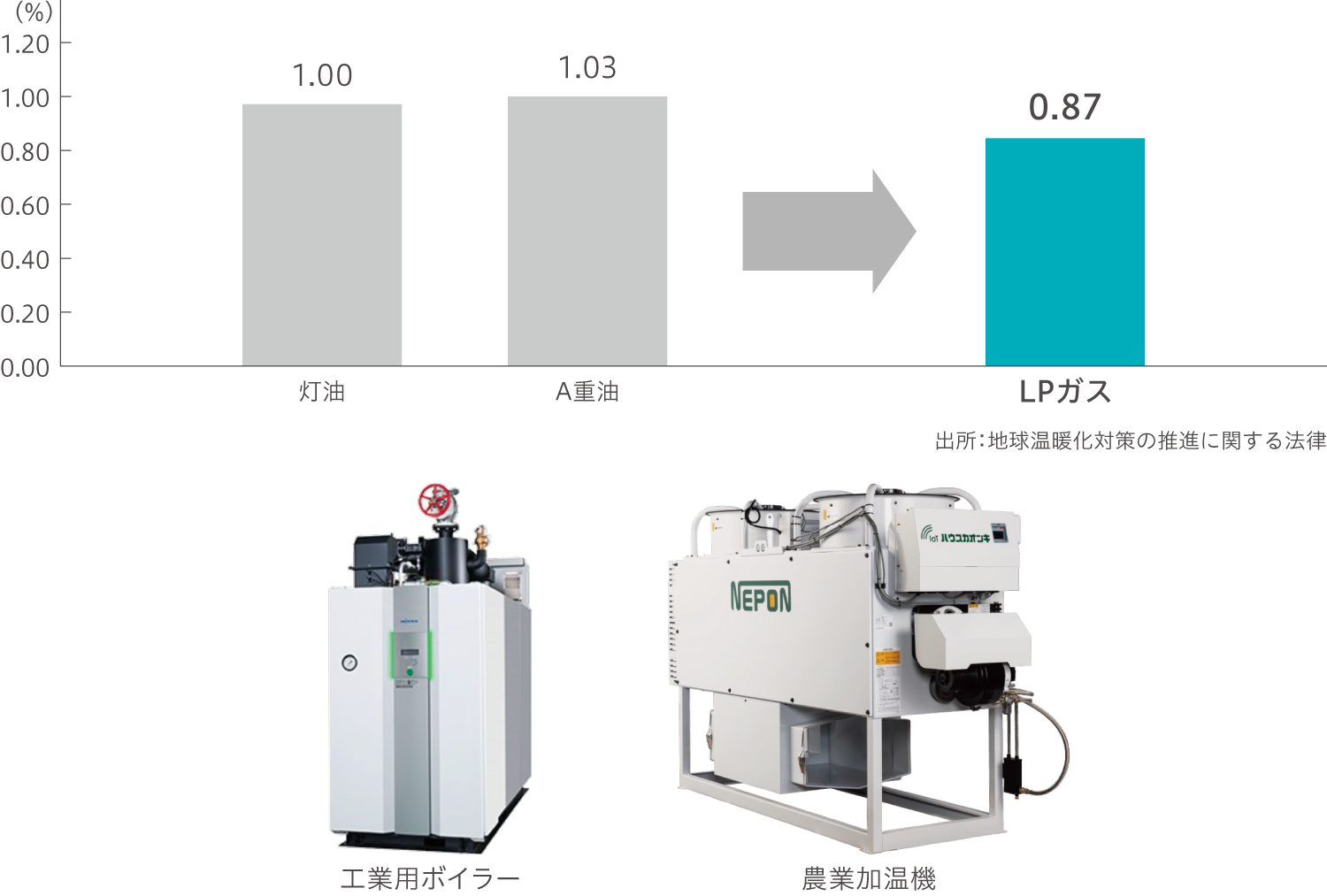LPガスは他の石油系燃料に比べCO2排出量が少ないことから、業務用途や産業用途で使われているA重油・灯油から、LPガスへの燃料転換を進めることで、国内全体のCO2排出量削減に貢献する。