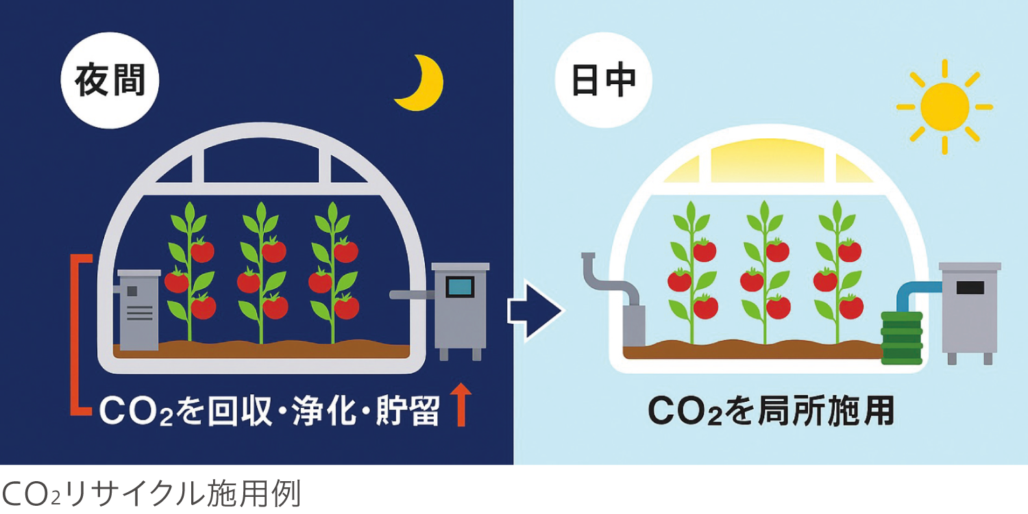 プロパンは灯油やA重油に比べ排ガス中のすすやSOx等が少ないことを利用して、排ガスをトマト等の作物を育てる際に行うCO2施肥の可能性を検討