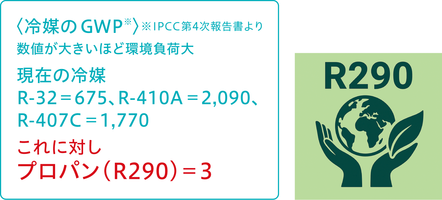 地球温暖化係数(GWP)が極めて低いプロパンをフロンに代わる冷媒として、家庭用エアコンでの利用可能性を検討