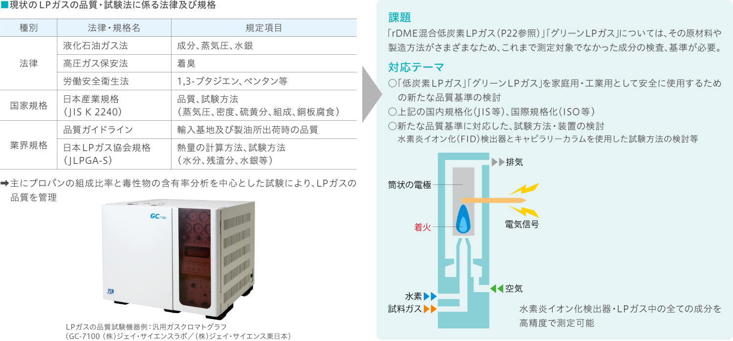 今後普及を目指す「rDME混合低炭素LPガス」「グリーンLPガス」に対応した新たなLPガスの品質基準及び試験方法を確立し、移行期及び将来においても安心・安全に利用できる体制を構築する。