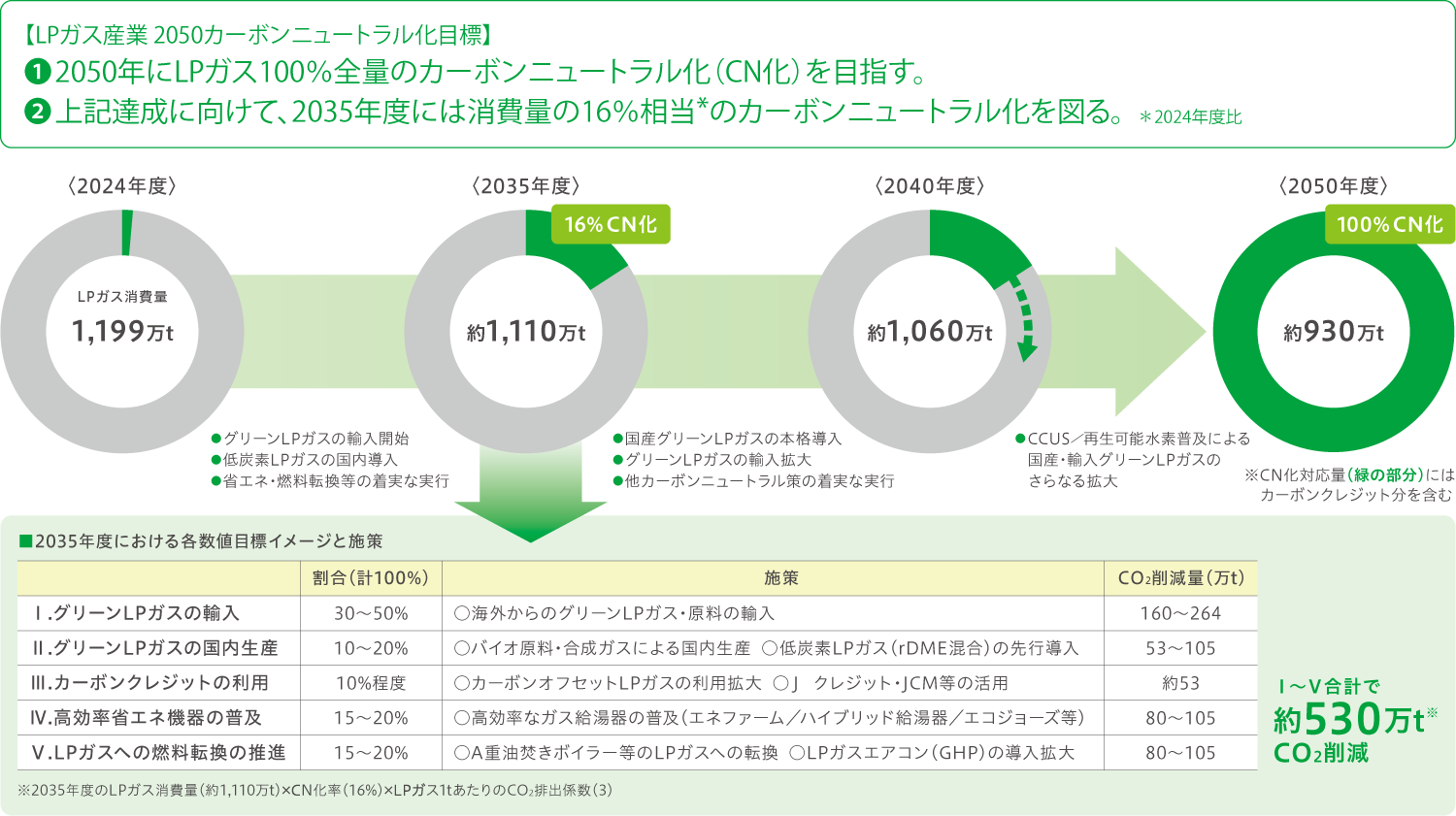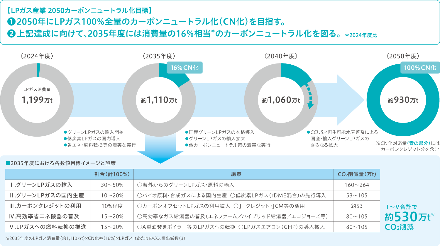 「LPガス産業 2050年カーボンニュートラル化目標」と「2035年度における目標と施策」を設定し、各施策を推進する。