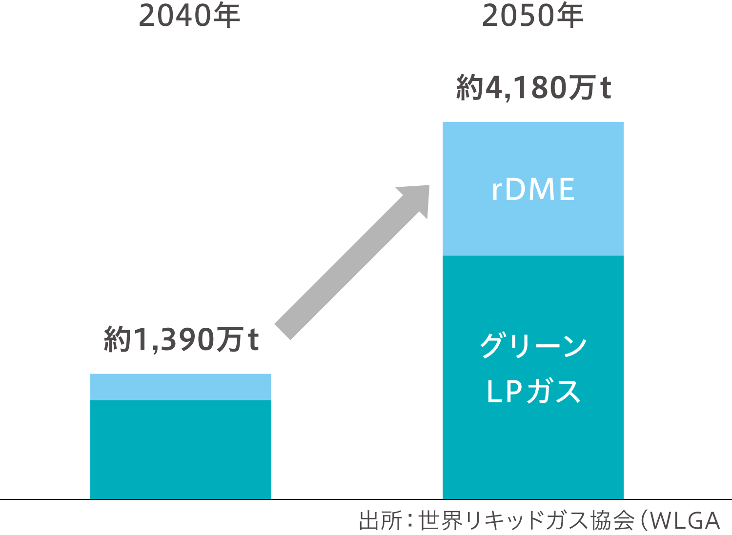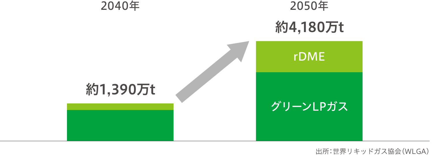 2040年に世界全体で1,390万トンの製造が予想されるグリーンLPガス等の調達を確実に進める。
