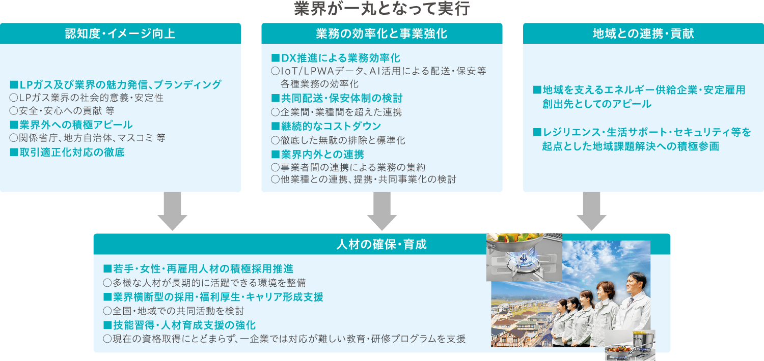 少子高齢化社会の進行に対し、LPガス業界は業界認知度・イメージ向上、業務の効率化、地域との連携・貢献を果たしながら、業界が一丸となって人材確保・育成に取り組んでいく。