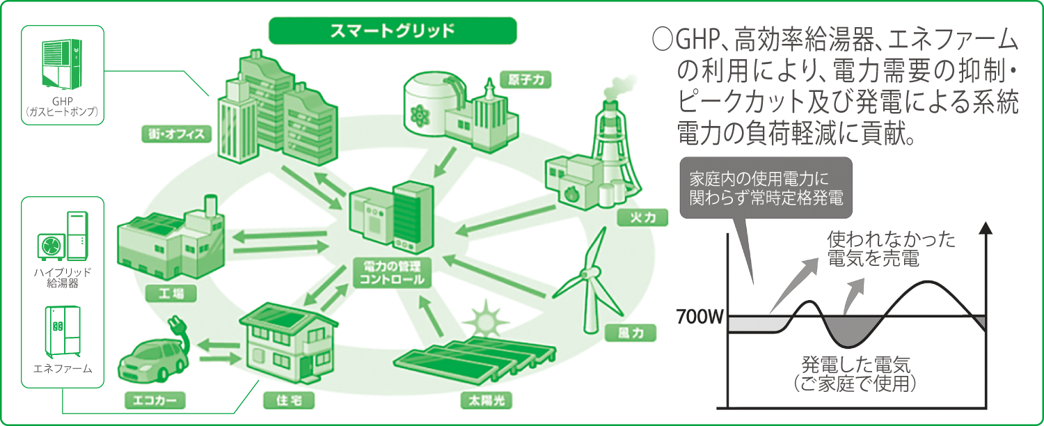 エネファーム等発電機能を持つLPガス機器を活用し、地域電力システムとの連携による電力ピークの抑制、エネルギー利用の最適化に貢献する。